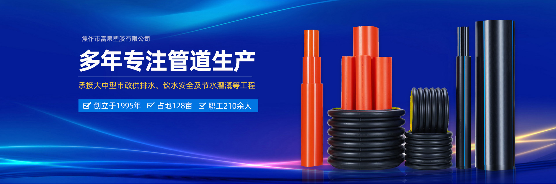 - 焦作市富泉塑膠有限公司,創立于1995年,是一家集研發、設計、生產、銷售為一體的大型管材企業。公司位于太極故里、黃河之濱一一河南焦作溫縣。公司占地128畝,現有職工210余人,其中具有中技術職稱的19人。生產、檢驗設備58臺(套),包括PVC實壁管生產線11套、PE實壁管生產線12套、HDPE雙壁波紋管生產線6套、PVC雙壁波紋管生產線5套,檢驗設備14臺(套)。主要產品有:Φ20mm-630mm、各種壓力規格的PVCU、PVC-M、PE給水管材,PVC-U節水灌溉管材,HDPE燃氣和礦用管材,DN200-800mm的HDPE、PVC雙壁波紋管及各種噴灌、滴灌工程材料。承接大中型市政供排水、飲水安全及節水灌溉等工程?! 「蝗苣z公司重視產品的質量、安全、環保和節能,在同行業中率先完成了“新華節水產品認證”,全方面通過OHSAS18001職業健康安全管理體系的一體化導入,并建立起規范的現代企業管理體系。公司以“質量”為先導,采用質量跟蹤、多環節把關的方法,組建具有行業水準的企業技術檢測中心,常年委托水利部節水灌溉設備檢測中心、河南省產品質量監督檢驗院對產品跟蹤檢測,并由中國人民保險公司承保產品質量。公司連續多年被河南省水利廳確定為“安全飲水設備、節水灌溉設備”定點生產企業,并獲得“中國名優產品”“質量、服務、信譽AAA企業”“河南省**產品”“河南省水利企業”“河南省守合同、重信用企業”等榮譽稱號?! 「蝗苣z公司堅持“用戶為上”的服務理念,長期以來,全方面關注客戶價值,不斷提升服務水平。服務隊伍常年為客戶的產品設計、施工、安裝提供合理的方案和全程細致、周到、**、快捷的技術服務。公司自成立以來,一直堅持以人為本的宗旨,塑造企業形象,并致力于新產品的開發,憑借雄厚的技術開發能力,先進的工藝制造流程,嚴格的質量管理保證體系,優良的售后服務網絡,已成為河南省大的飲水、灌溉及排水管材設備制造商。產品暢銷全國,而且還以公司雄厚的綜合實力在業界中占據著重要的地位。